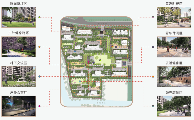 社区内打造森氧绿境,环形健身跑道、亲子互动区、老年休闲廊架等全龄活动空间齐全;