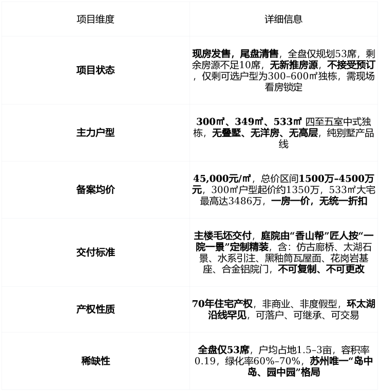 💡 提示 :剩余房源均为实景现房,庭院已完工, 仅剩3席带完整太湖景观+游艇泊位 ,建议携带家人实地体验“推窗见湖、入院即园”的沉浸式生活。