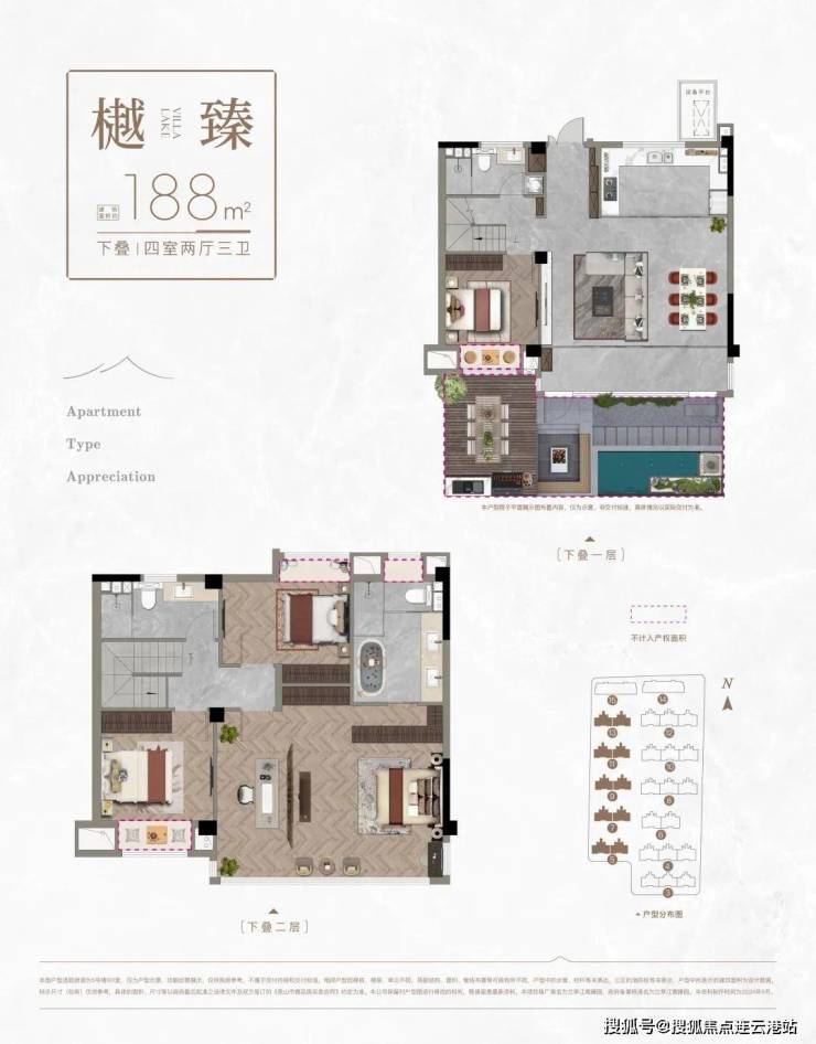 中下叠:约188㎡(四房两厅三卫,下叠赠35㎡南花园,中叠赠15㎡北花园)