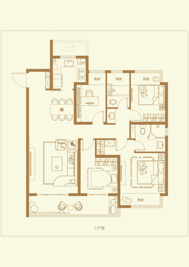 约148–156㎡四室两厅两卫:全屋飘窗,客厅开间阔绰,采光视野极佳