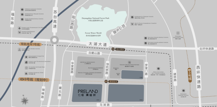 全龄教育资源:苏州外国语学校附属阳山幼儿园/苏州高新区实验小学分校秦馀小学校/苏州高新区景山实验初级中学/苏州高新区第一中学科技城校区;