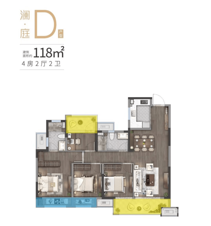118㎡:四开间朝南,动静分区,适合三代同堂。