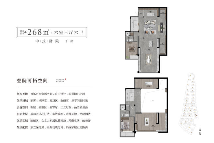 2、下叠245-275㎡(赠送院子65-300㎡,赠送地下室挑高5.6m,可隔2层,面积约117-150平。)