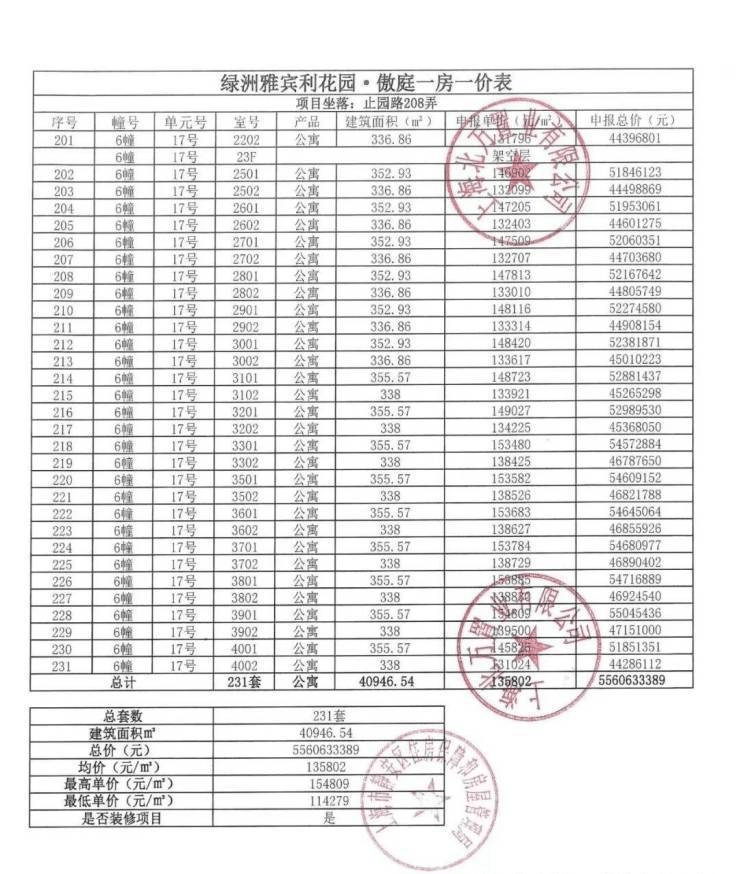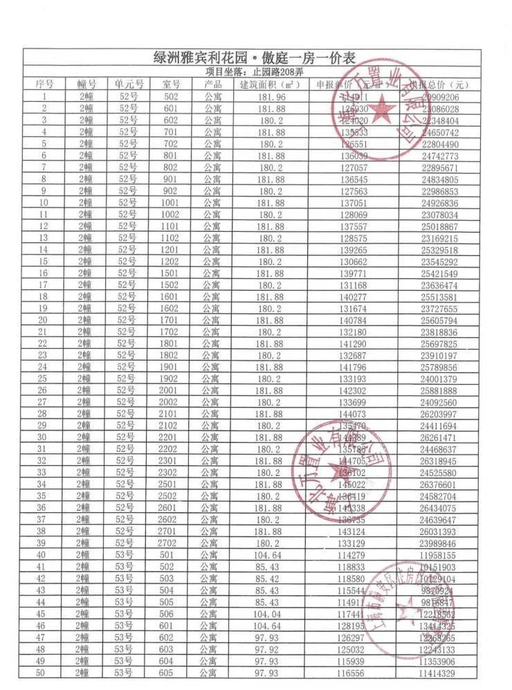 一房一价表发布