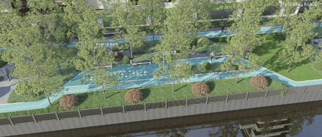 借景古塘河,为业主打造约2600㎡水岸公园,含水杉树阵、绿地草坪、400米跑道及健身设施等