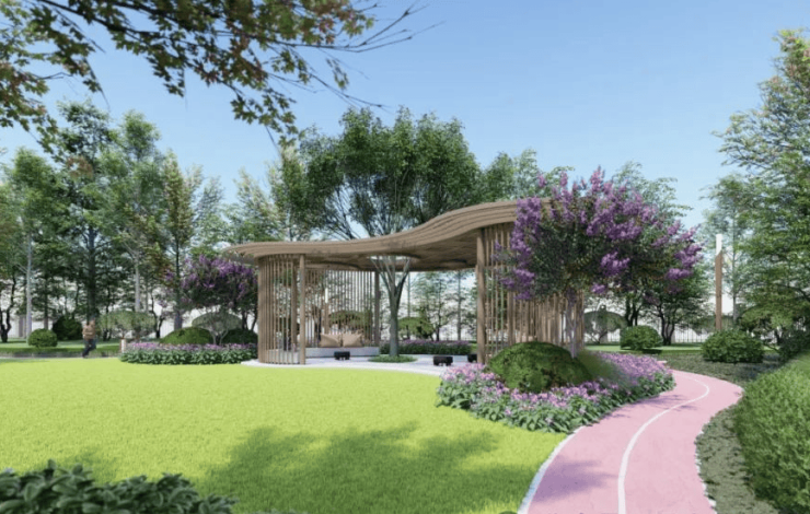以自然会客厅为核心主景,融入艺术廊架、阳光大草坪、泛会所架空层、健康跑道、儿童乐园等功能场地