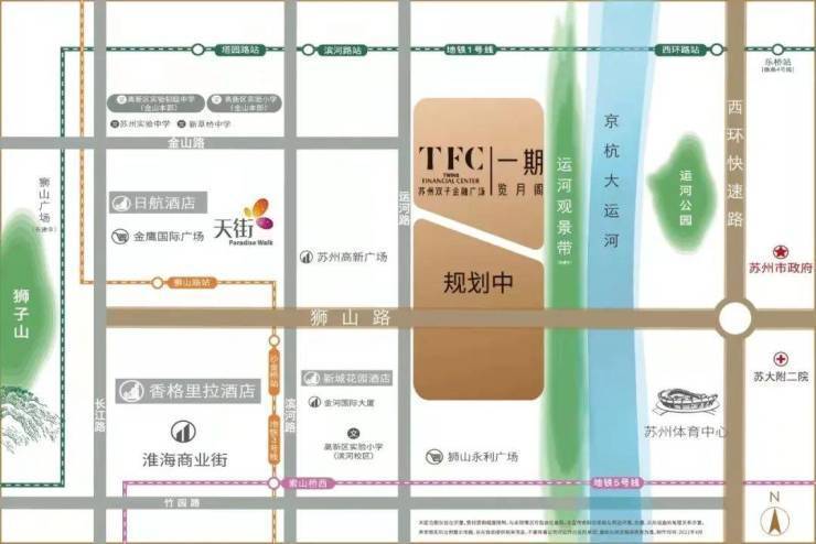 本项目在狮山 桥下,京杭大运河旁,占据了新区狮山板块的核心地段,坐享新区繁华商圈,紧邻姑苏古城风韵,集人文精神和高品质生活为一体,将打造为狮山板块乃至苏州市具有代表性的地标建筑。