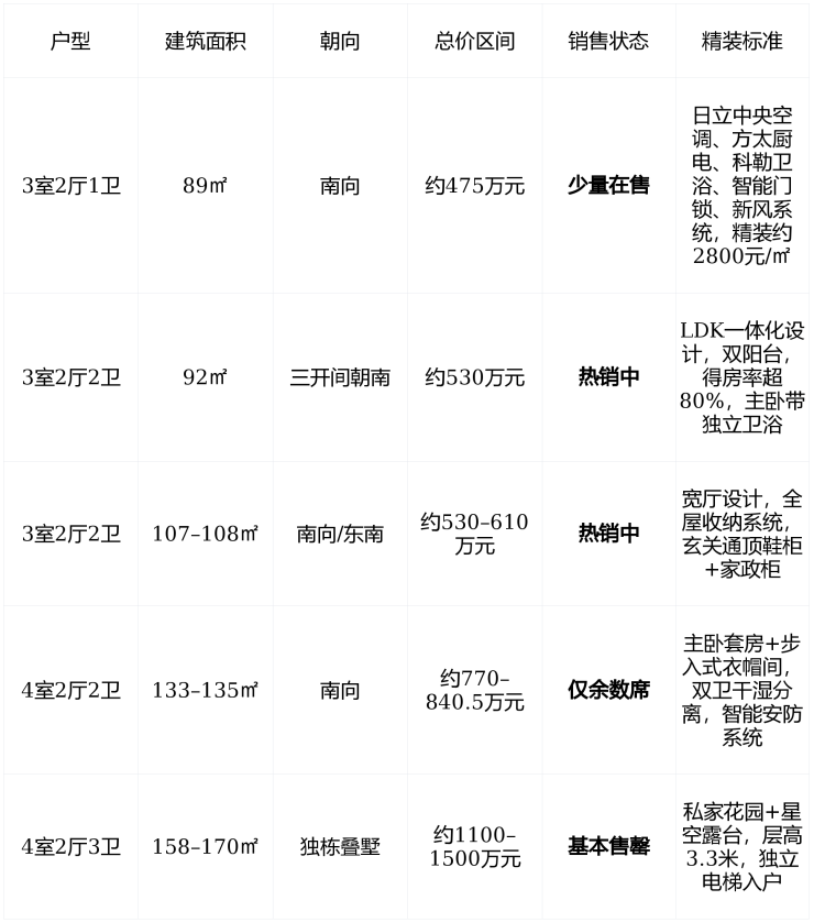 在售户型 :主力在售为 89–135㎡ 三至四房高层 ,总价 475–850万元 ,均价 56,992–58,500元/㎡ , 叠墅已基本售罄 ,当前为 热销冲刺阶段 , 2026年6月集中交付 。