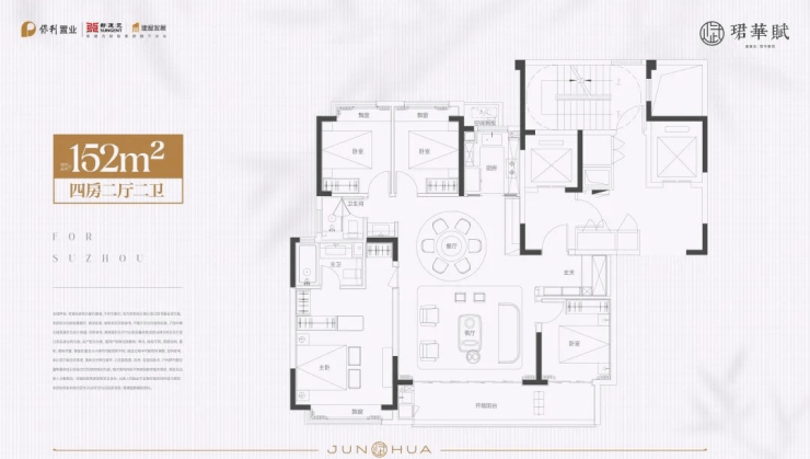 四房两厅两卫,整体布局与建面约152㎡户型基本一致。