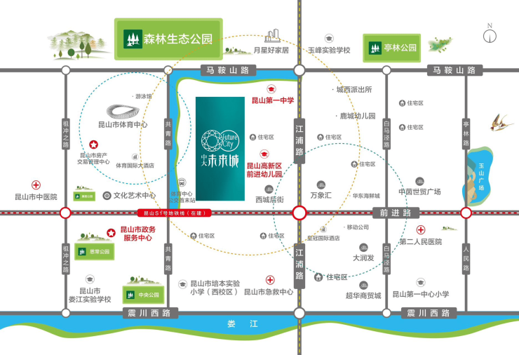 位置:昆山市城西前进路与体育场路(共青路)交汇处,临近苏州地铁S1号线规划站点