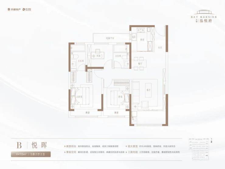 天健泓悦府的户型设计多样,面积从103平方米到200平方米不等,能够满足不同家庭的居住需求。对于追求舒适生活的三口之家,103 - 113平方米的三居室是不错的选择。这类户型空间布局合理,功能分区明确,南向约10.4米大面宽开间,保证了居住空间的充足采光;南向景观阳台和全屋飘窗设计,让居民可以纵观四季流转,推窗即景;U型厨房人性化设计,动线合理,让生活更加便捷;主卧套房设计,定制独立衣帽间和浴缸,让日常充满情调与仪式感。。