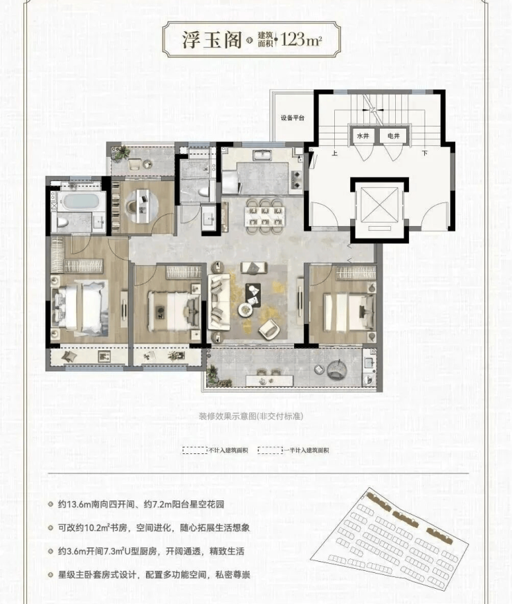 科技洋房:面积123㎡,共3栋10层洋房,四开间朝南设计,配备南北双阳台
