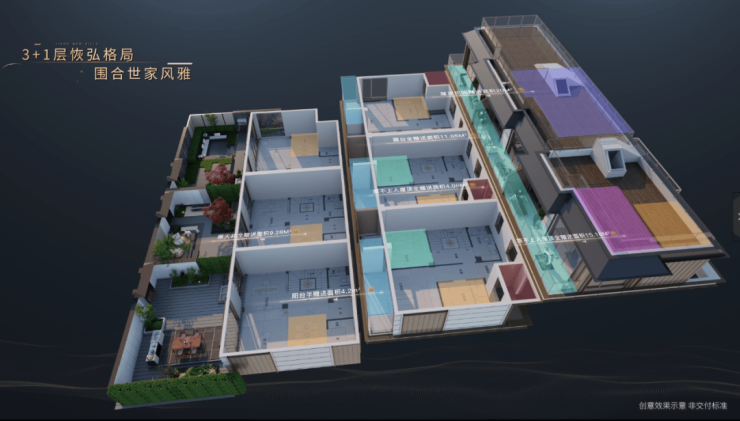 联排别墅:面积133-158㎡,共25栋3层联排,首层挑空3.4米,二、三层层高3米,全装修交付(标准2000元/㎡起)。总价268万元起,得房率及赠送率超200%