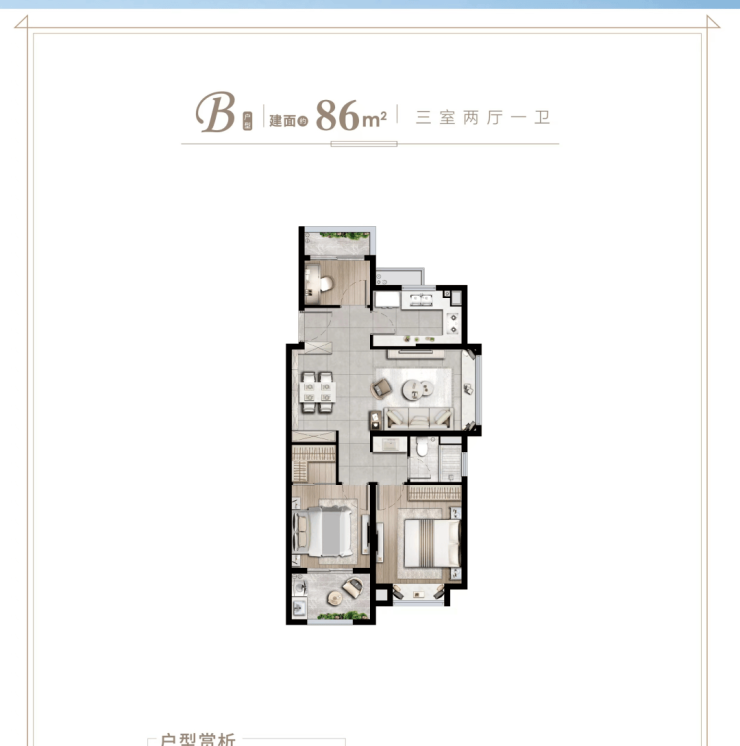 ①86平(三室两厅一卫) 边套户型,三面采光