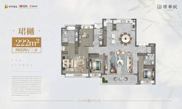 户型纯粹性:全系152-222㎡大平层,主力四房设计,其中190/222㎡户型采用双套房+家政间配置