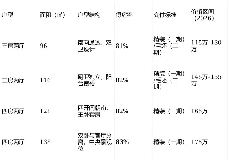 建议 :优先选择一期138㎡中央楼栋(8、10号楼),避开临主路低层;二期若为刚需,可选96㎡户型,但需接受毛坯+高层密度。