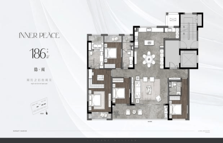 面积段:130-265㎡,覆盖刚改至高端需求,其中186㎡户型设计5套房+270°转角阳台