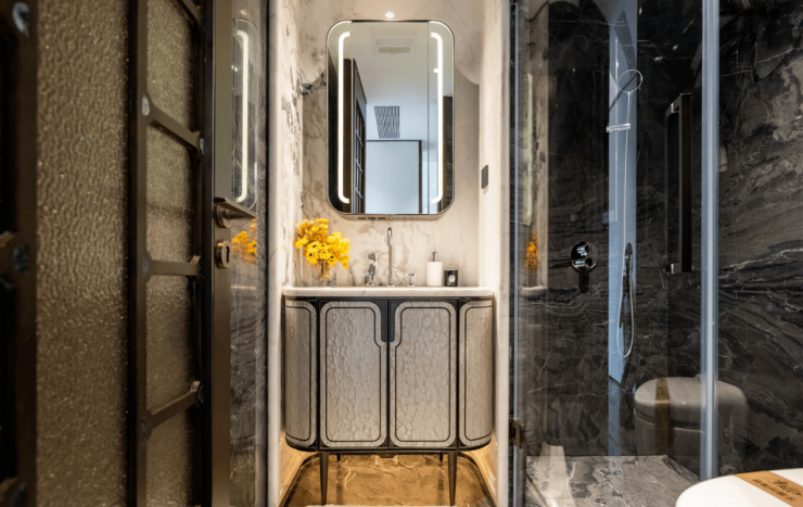 区别于常规豪宅仅以奢石作为点缀,绿城黄浦ONE在多个空间大手笔地采用了整体铺贴的设计