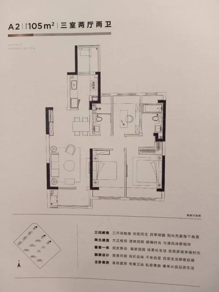 105㎡:三房两厅两卫,南北通透,动静分区。