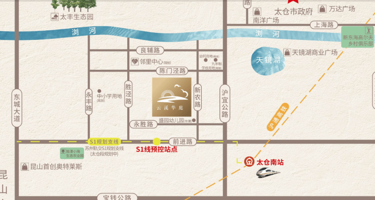 高铁通勤:直线距离太仓南站约4公里,沪苏通铁路30min直达上海虹桥站,通勤效率媲美上海市区地铁