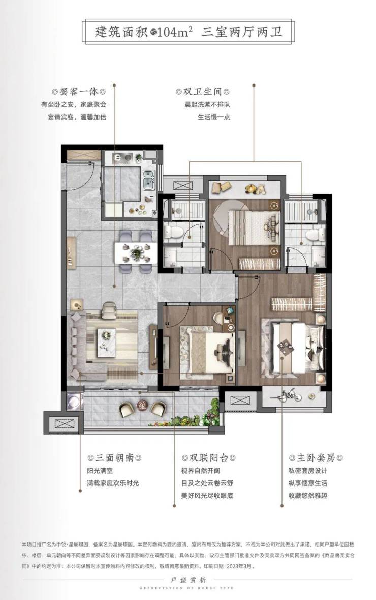 主力户型为建面约89㎡、104㎡、117㎡的三居室,均为准现房交付(竣工时间2023年)