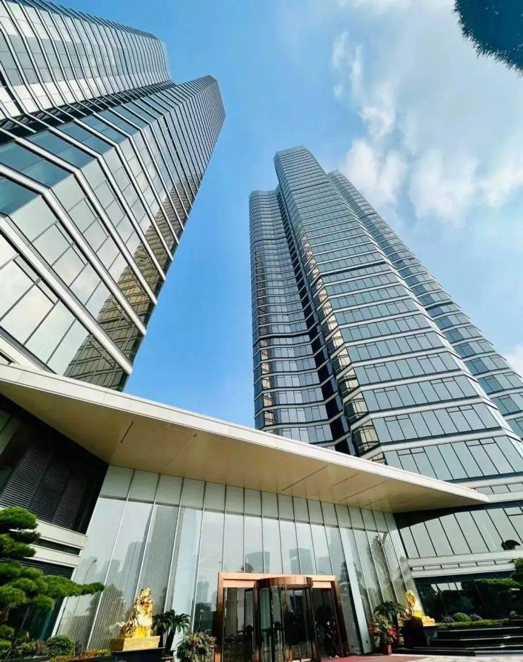建筑立面以杭州市花“桂花”为灵感,采用四瓣曲线造型与鎏金玻璃幕墙结合,打造钱塘江畔光幕地标