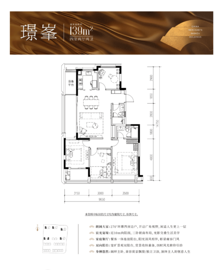 139㎡:四房两厅两卫,三开间朝南,约10米面宽,带环幕采光