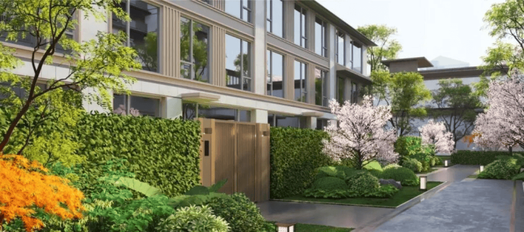 云栖海棠里建筑采用公建化立面,勾勒出简约、通透的东方美学形象。南向采用超高窗墙比设计,最大化引景入室,让建筑充满光感与呼吸感,实现与自然环境的交融共生。