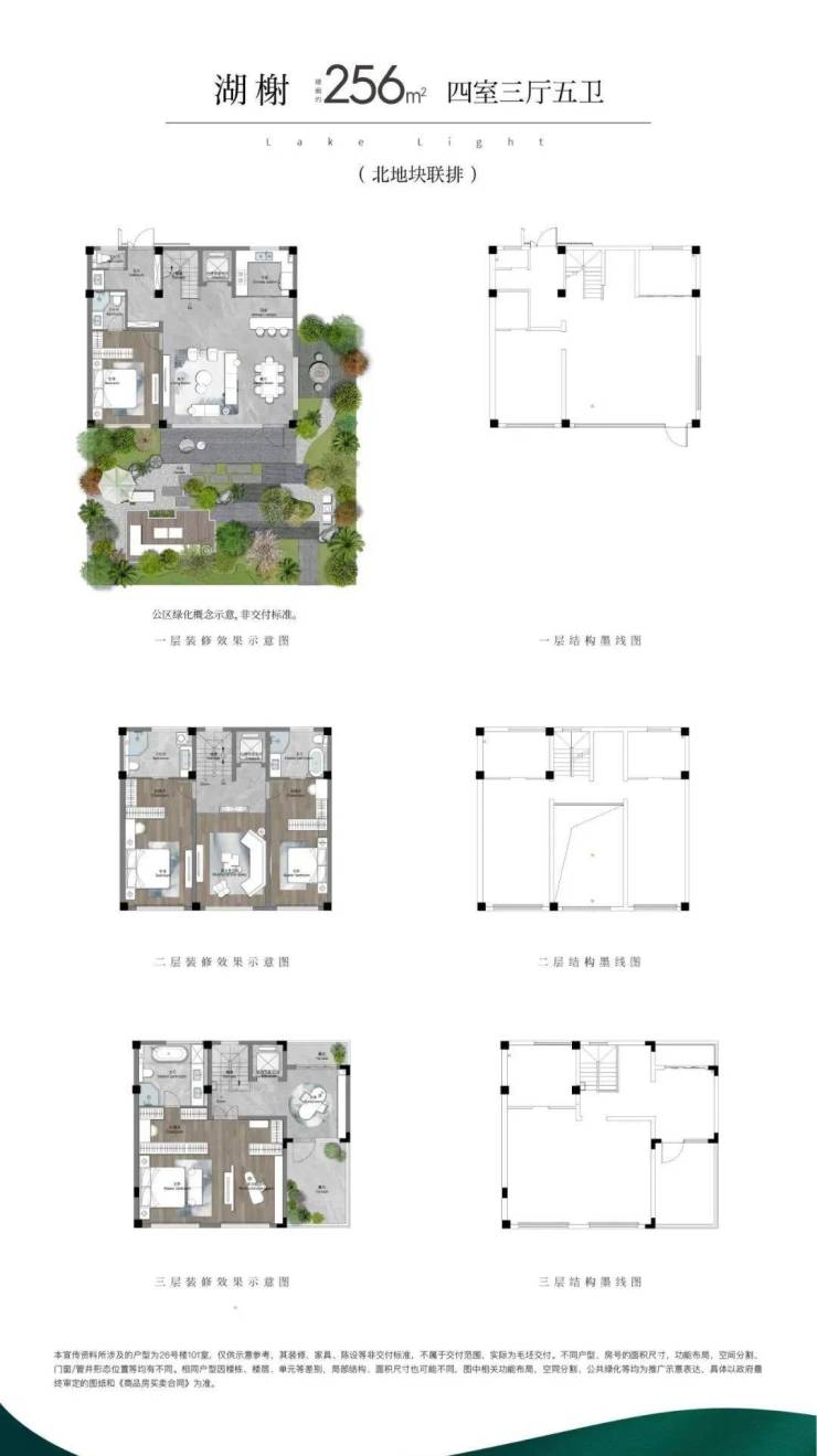 (1)联排:打造约246m²、约256m²(边户)、约280m²三个户型面积,以迭代的联排作品,致敬真别墅的回归