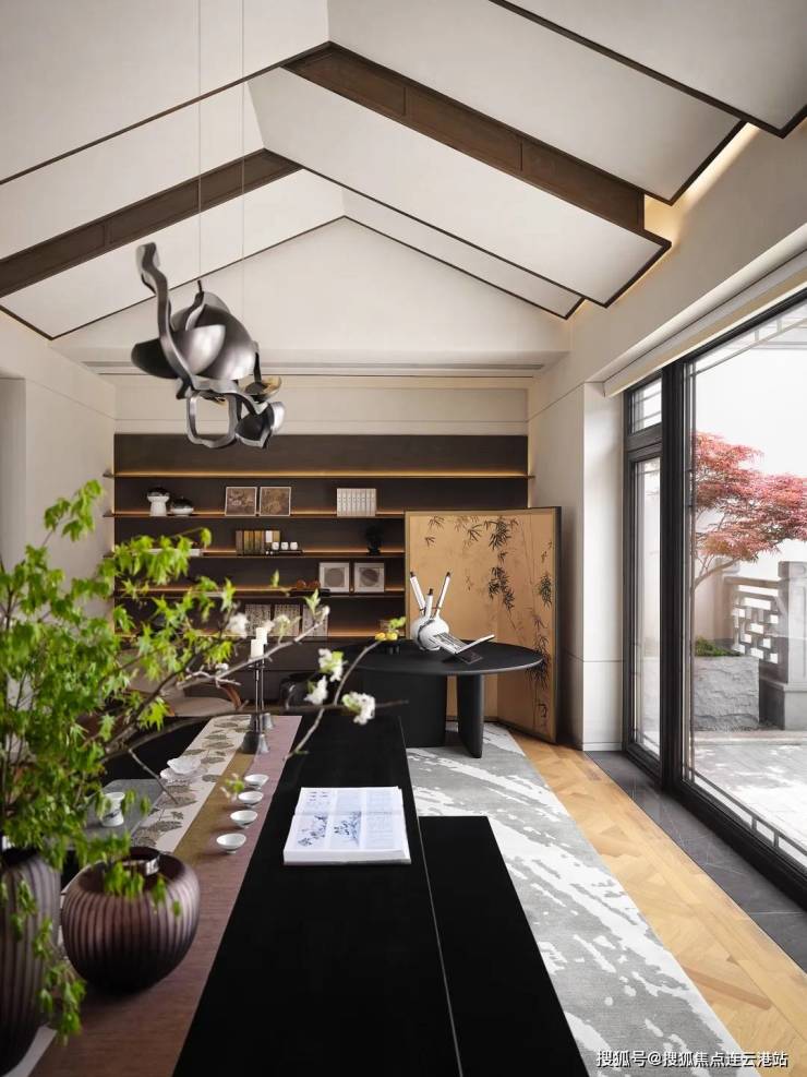 餐厅与客厅通过长长的、金属动态处理的现代木质茶桌相连。同时,这张茶桌连接的也是传统的生活意趣和现代的生活习惯:依旧品茶,未必要用旧桩陈盏;仍然插花,并非囿于梅兰竹菊。