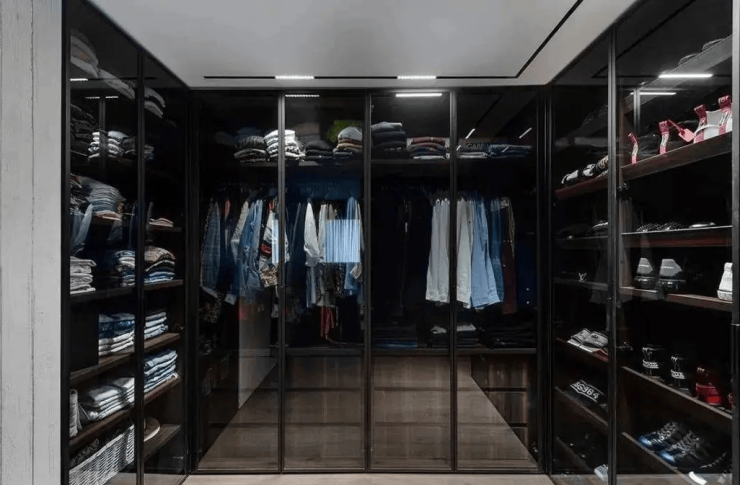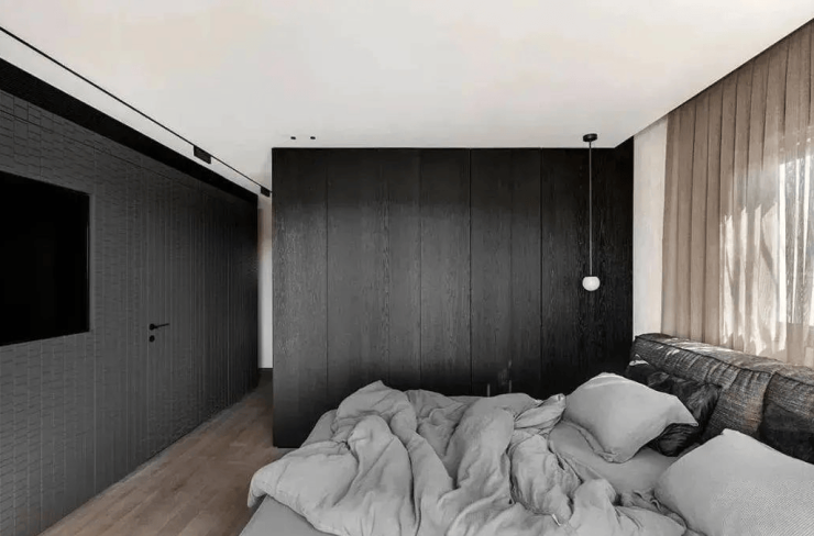 卧室的设计简洁而不失温馨,暖灰色的墙壁让空间显得更加纯净,没有任何多余的装饰。床头吊灯的线条感十足,散发出柔和的黄色灯光,为整个空间增添了一丝暖意。步入式衣帽间的设计非常实用,合理的布局让衣物拿取变得非常方便,给屋主带来了舒适的体验。整个卧室不仅简洁大方,而且充满了实用的功能性和温馨的氛围,是一个非常舒适和宜居的空间。