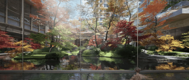 近1000㎡下沉庭院,取法名园造景精髓,精选乌桕、紫薇等古树名木,复刻苏式园林风貌