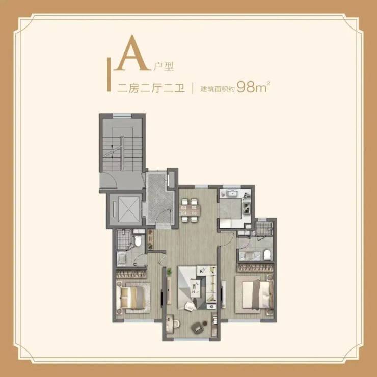 建面约83㎡两房两厅(紧凑型改善,得房率79%)