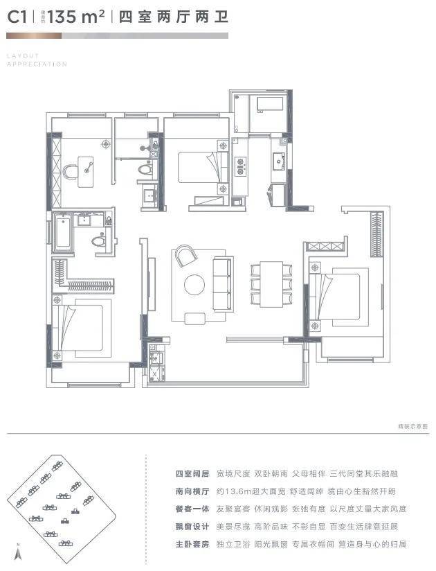 雅乐云庭建面约125㎡的四房两厅两卫户型,拥有四开间朝南的布局,南向面宽超过12米,确保了充足的阳光照射。餐客大横厅的设计,不仅使空间显得更加开阔,更方便家人之间的互动与交流。
