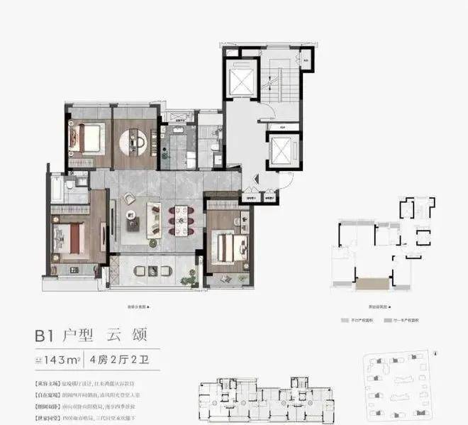 143㎡四房两厅两卫:主卧套房+独立衣帽间,大横厅设计