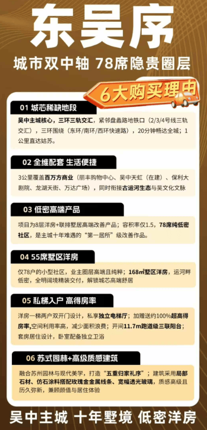 核心价值 :在苏州新房供应日益稀少的当下,东吴序以“城芯、低密、三轨、文化”四大要素,成为绝版资产,适合追求圈层认同与生活品质的购房者。
