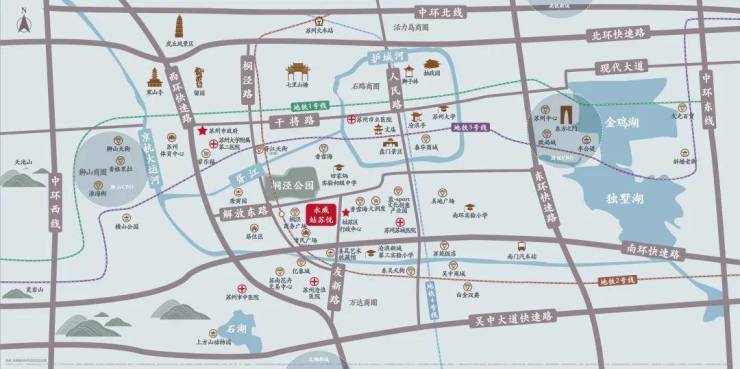 南侧约200m为南环高架出入口,双环线接驳苏州中环、G2和G15等主要交通干线。