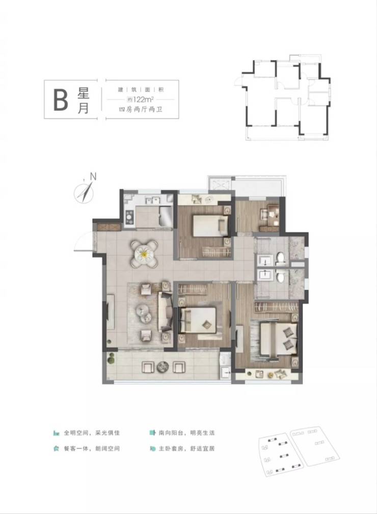 建筑规划 :总占地约57亩,规划12栋住宅(含小高层与高层),容积率2.3,绿化率35%,采用现代简约立面风格。车位配比1:1.17,满足家庭需求。