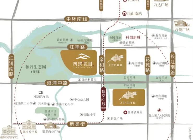 地铁:规划中的昆山K1线(苏州地铁11号线延伸段)从项目东侧约500米经过,未来可在玉山广场站换乘S1线,直连上海地铁11号线,实现“工作在上海、居住在张浦”的通勤模式;