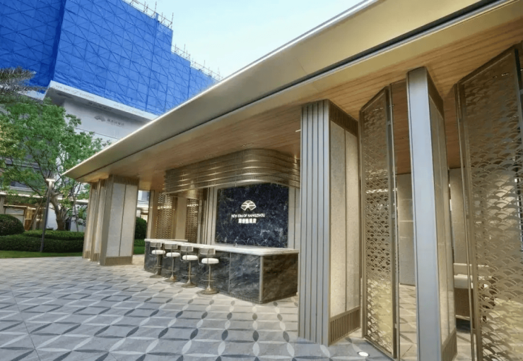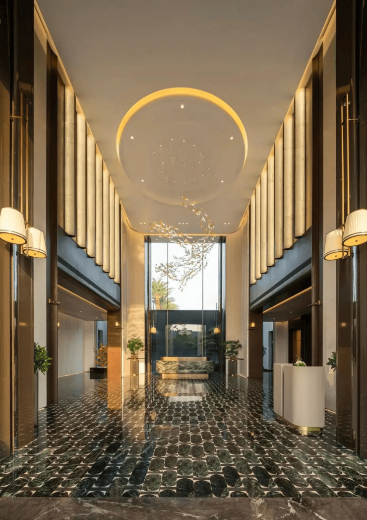 主入口设计:约9米高、30米宽的奢尺门庭,融合“金镶玉”温润质感与“天圆地方”形制,彰显江南望族礼序