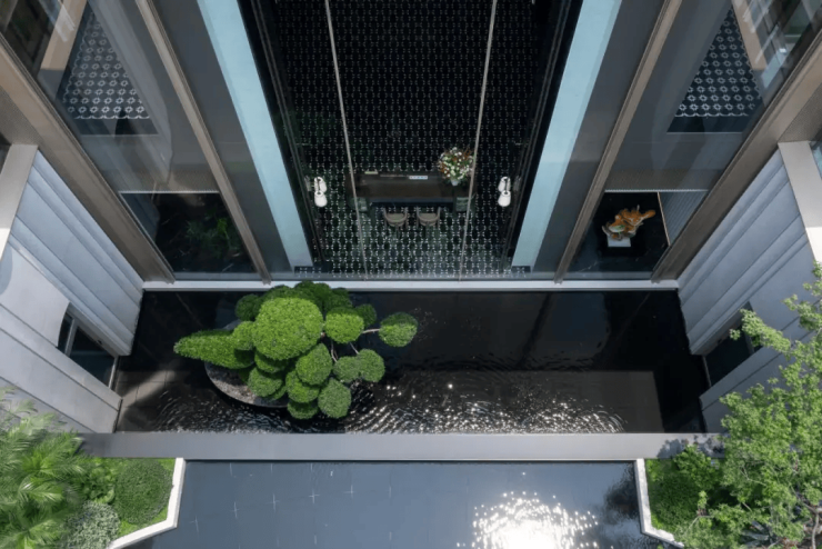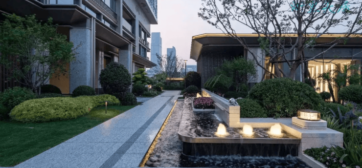 中央水景:奢石飞瀑、松涧迎门,结合镜面水景与金色挑檐,营造艺术馆式归家体验