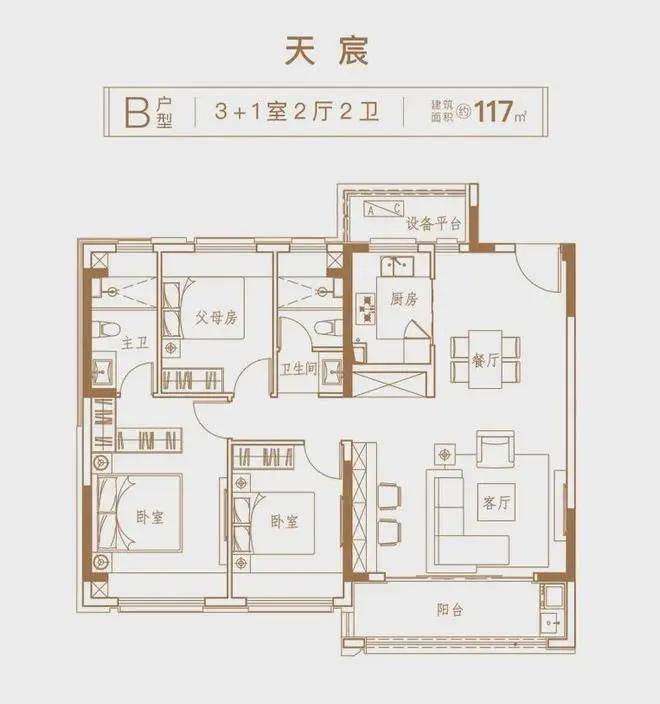 117平米户型布局大气,3+1房2厅2卫