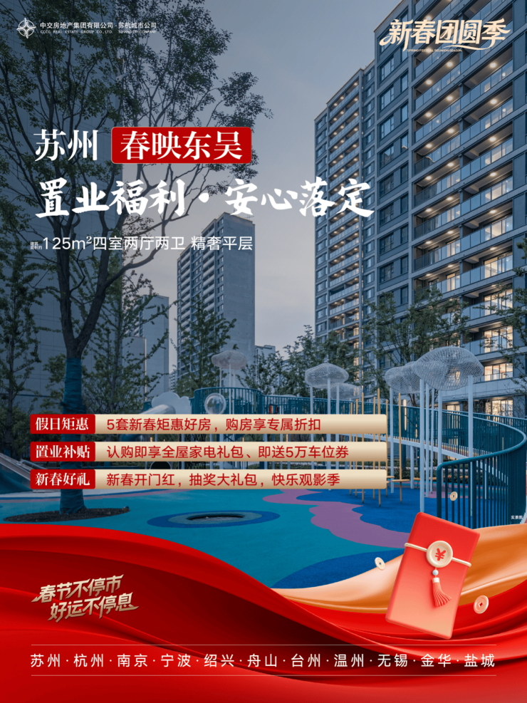 中交春映东吴由央企中交地产,联合苏州华启地产倾力打造,万亿品牌背书,从建筑施工到细节打磨,全程遵循严苛标准,品质更有保障。项目已于2023-2024年分批交付,目前全实景现房销售,购房者可实地考察户型格局、装修标准与社区环境,彻底规避烂尾、延期等风险,实现“所见即所得”的安心置业体验。400 998 3632中交春映东吴营销中心电话