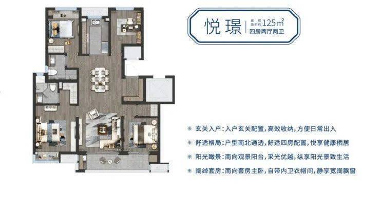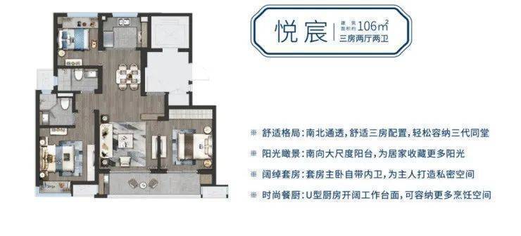 项目共推出两种户型,建面约106平米的三房两厅两卫和建面约125平米四房两厅两卫,均为精装修交付。建面106平米的三房户型,布局紧凑,功能齐全,适合三口之家;建面125平米的四房户型,空间阔绰,南北通透,适合二胎家庭或三代同堂。