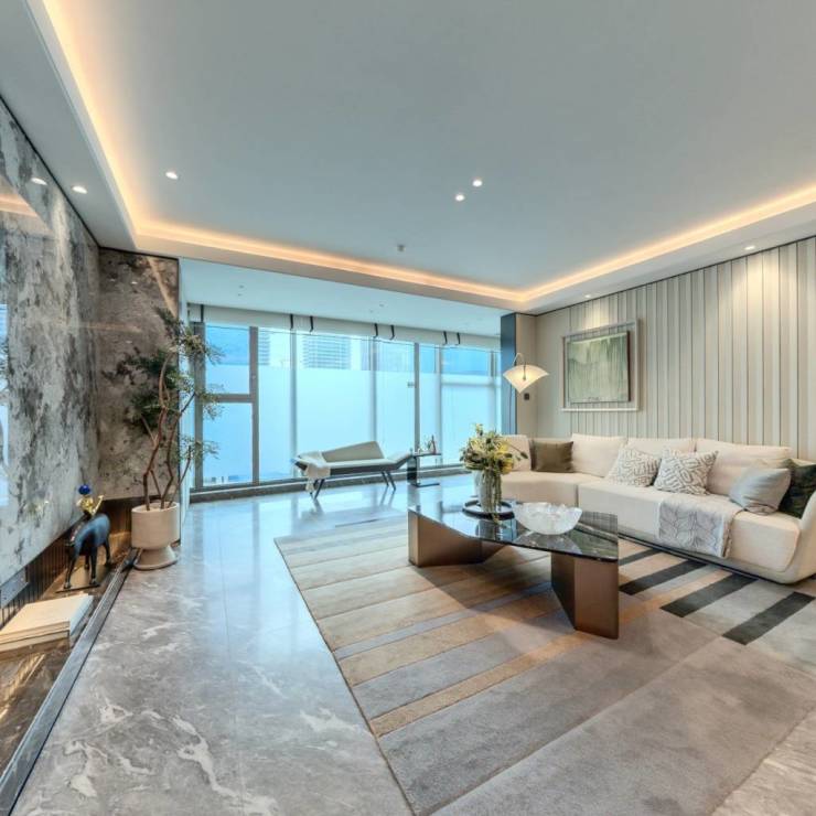 目前在售约153-223㎡科技豪宅大平层,精装标准很高,厨房博世5件套;FRANKE弗兰卡水槽,唯宝、汉格雅思卫浴...室内硬装细节也非常丰富,吊顶、玄关、背景墙等等随处可见奢石、岩板等。