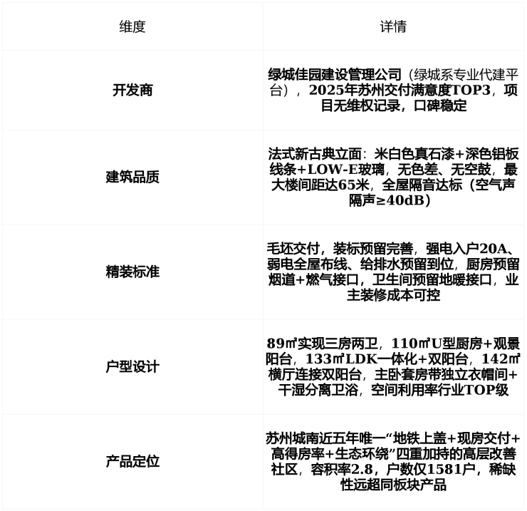 核心优势绿城佳园开发+绿城物业 + 容积率2.8高层社区 + 绿化率26%五大主题园林 + 步行500米直达地铁4号线“团结桥站” + 1公里内覆盖苏州学府实验小学、木渎南行实验小学 + 3公里内惠润姑苏邻里中心+苏大附一院高新康复医院 + 周边3公里40个公园环绕,生态密度苏州罕见吴中区少有的“现房+高得房率+生态宜居”改善标杆