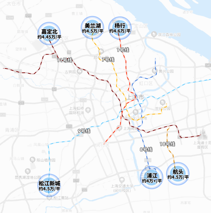 据最新统计,目前上海能通勤传统中央商务区的地铁线,远郊终点站的新房单价几乎全部超过4万,大多数在4.5万左右!