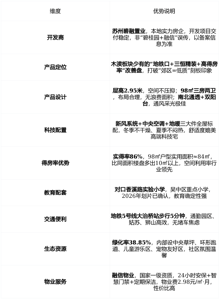 ✅ 核心结论:木渎金枫路地铁口精装改善盘,2026年7月交付,98㎡三房起,得房率86%,全屋标配新风+中央空调+地暖