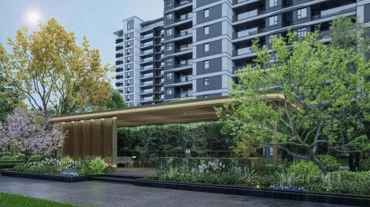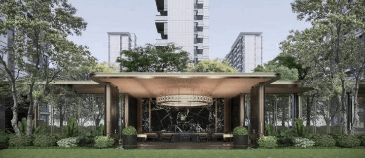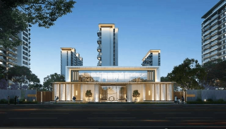 项目采用现代简约建筑风格,外立面采用大面积玻璃幕墙搭配铝板线条,整体呈现高端质感。园林设计由国际知名景观公司贝尔高林操刀,打造"一轴三园五境"的景观体系,中央景观轴长达150米,包含全龄活动区、阳光草坪、艺术水景等多元空间。