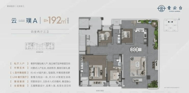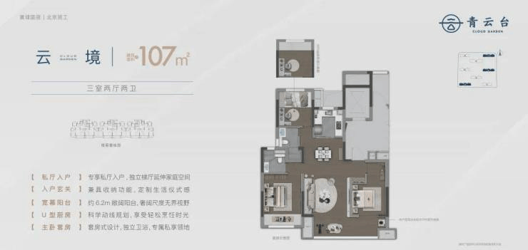 青云台是由苏州本土知名开发商苏州高新地产倾力打造的高端改善型住宅项目,位 于相城区核心发展板块——高铁新城片区。项目总占地面积约8.6万方,总建筑面积约22万方,容积率2.5,绿化率35%,规划建设12栋18-26层的高层住宅,共计约1200户。项目定位为"城市精英品质住区",主力户型为98-143㎡的三至四房,精装交付标准达4500元/㎡,目前均价约32000元/㎡,总价区间在310-460万之间。